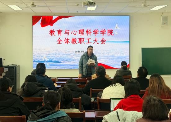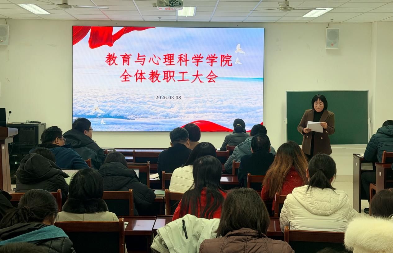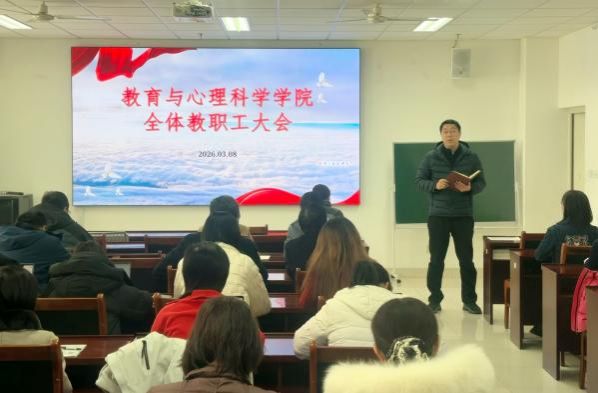 3月8日,教育与心理科学学院召开教职工大会,传达学习中共济南大学四届八次全委会扩大会议精神。学院党委书记卢琦主持会议并讲话,全体教职工参加会议。